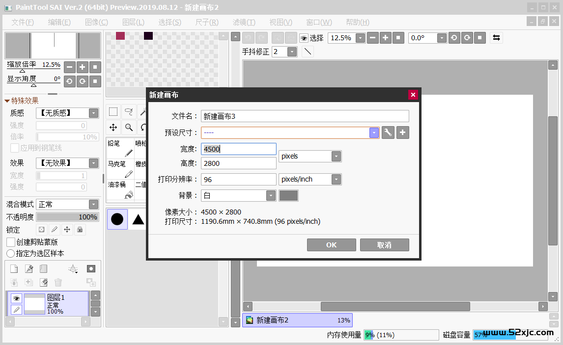 办法一:双击翻开电脑上一经装置好的SAI软件,并遵照自身的需求,新修一个或众个画布;