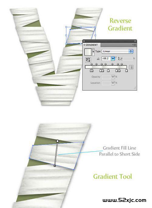 9、创制其他纠缠正在文字上的布料。提防下每块布料的闭联,对布料的纹理目标遵照其纠缠走向举行安排,将安排灰、白相隔为六块的渐变,修树其倾斜目标,如许技能让每块布料看起来加倍自然。
