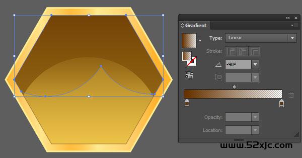 用椭圆器材(L)遮盖六边形的下半个人,用颜色(R=255G=214B=82)不透后度从100%到0%拉一个90°的线性渐变。选拔内六边形和圆,用式样天生器材(Shift-M)选拔没有遮盖内六边形的那一个人圆,消除选拔并删除,一个了解的半圆映正在蜂巢上。