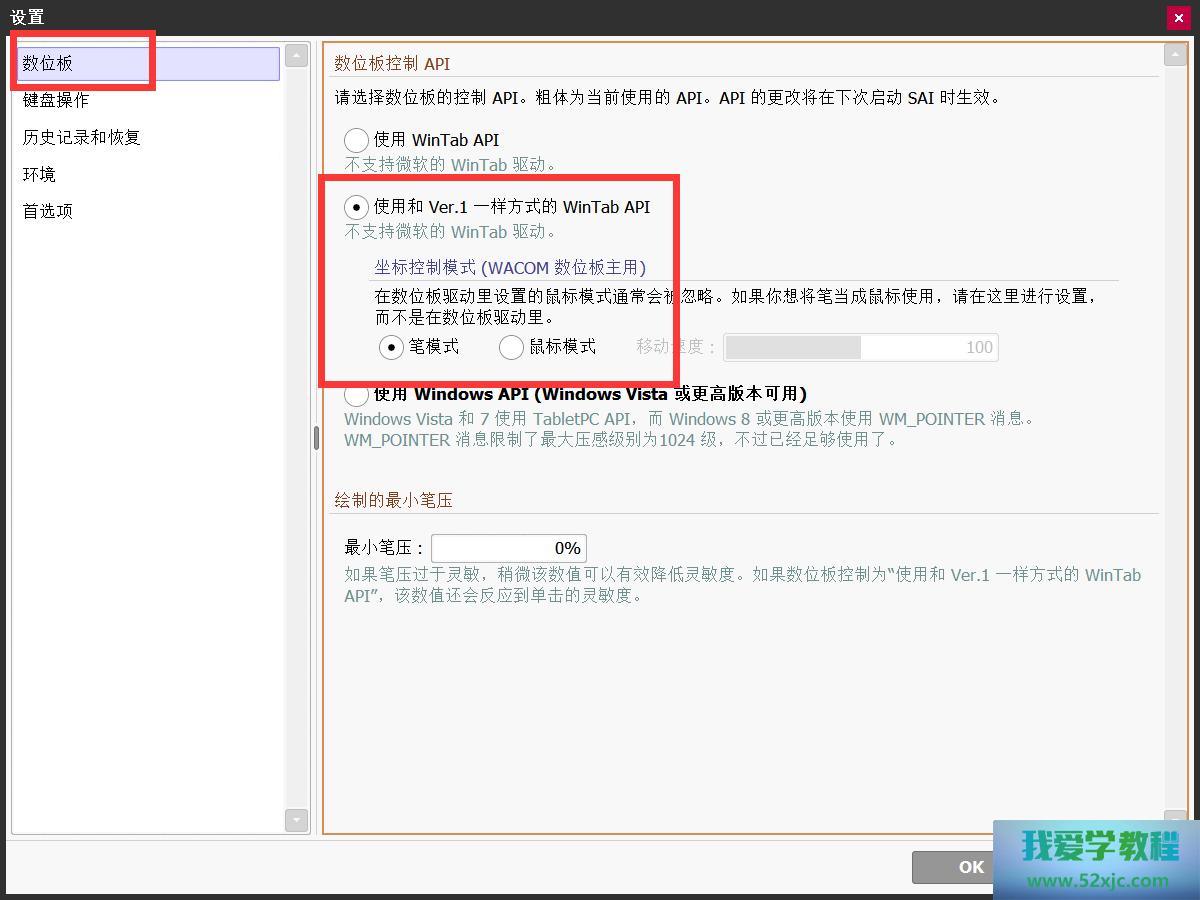 4、查验画笔是否为“笔形式”。查验的手法是:点击“助助”菜单中中的“创立”选项,然后点击“数位板”中的“运用和Ver.1相同方法的WinTab API”,结尾点击“笔形式”即可。