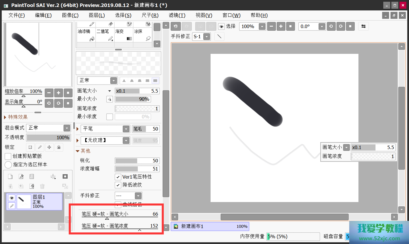 5、正在画笔的创立下找到笔压创立,而且对笔压画笔巨细以及画笔浓度的软硬度举行安排,而且这个期间咱们就可能看到创立好画笔笔压后,绘制的结果了。