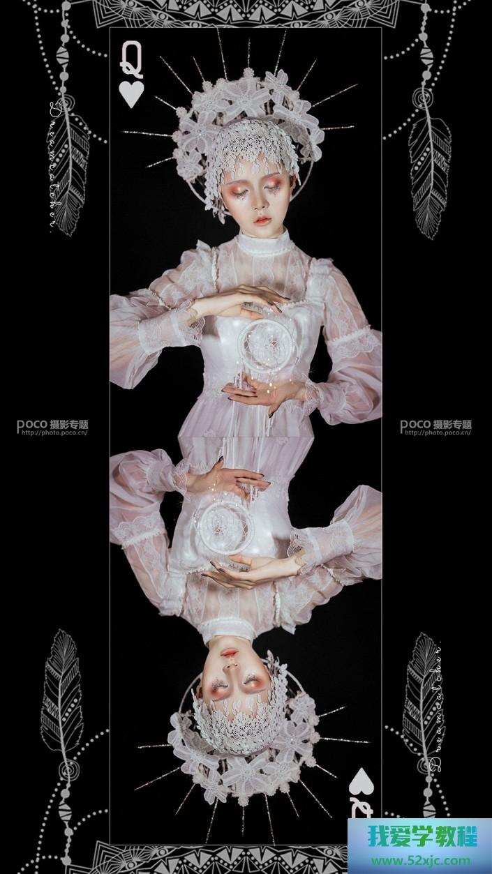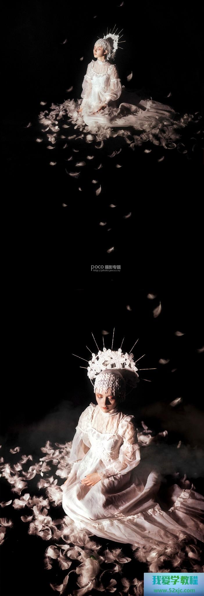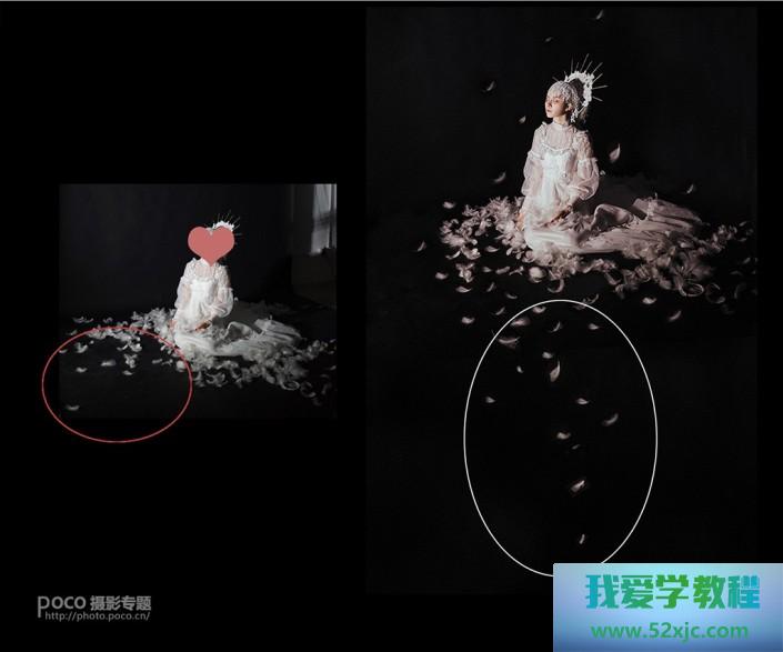 最先树立玄色后台,把人物放正在画面上方地方,调度色阶和蒙版让画面融入后台。念要加点什么素材呢?散落一地的羽毛是不错的采用,采用东西或仿制图章采用地面上的羽毛从新摆列到你念要粉饰画面的地方,右图白圈里的羽毛本来都是拾取左图红圈里的,也省了许众找素材的烦杂。右图杀青之后单张就挺体面,也可能跟下图连合做再次创作。
