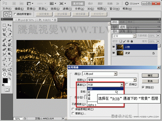 (4)正在对话框入选择配景图层,采用哪种通道形式举行夹杂。