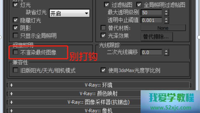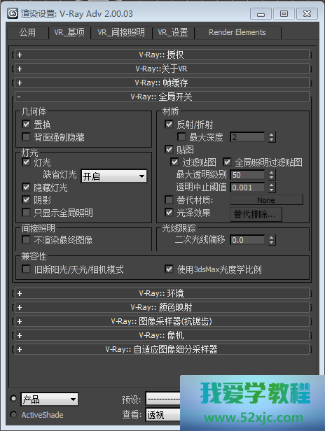 3、匮乏灯光导致的全黑景色,敏捷键F10,打块整体开合(若不是Vray陪衬器,要正在“共用”里指定陪衬器采用Vray)“灯光”前打√,“缺省灯光”里采用“开启”