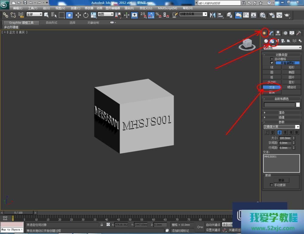 手腕/办法第1步掀开3Dmax2012软件,点击【创修】-【几何体】-【长方体】,正在作图区域绘制一个长方体模子。点击【创修】-【图形】-【文本】,完毕字体片面的创制,接着完毕饰品模子的创制(如图所示);