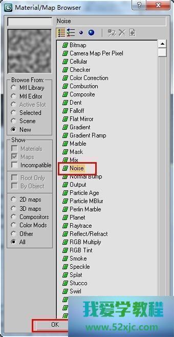 第3步正在弹出的【Material/Map Browser】(材质/贴图浏览器)对话框找阿谁选拔【Noise】(噪波),单击【OK】按钮,如图下图所示。