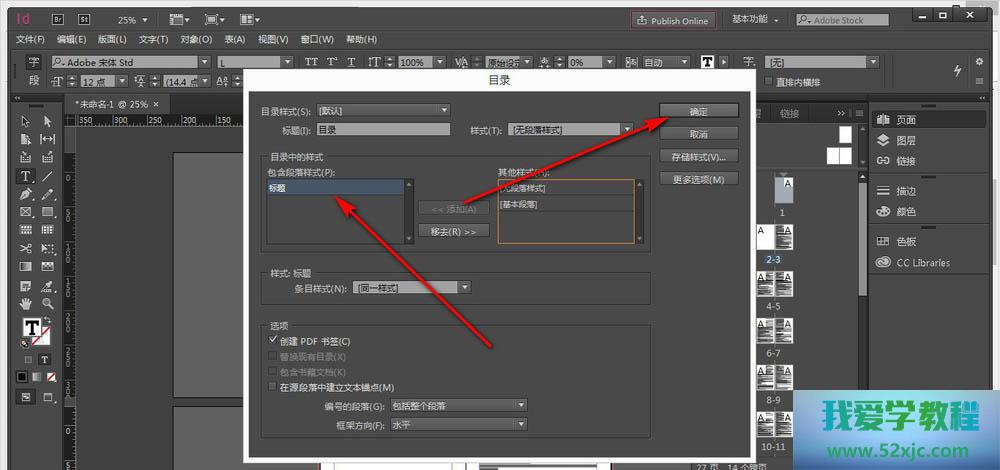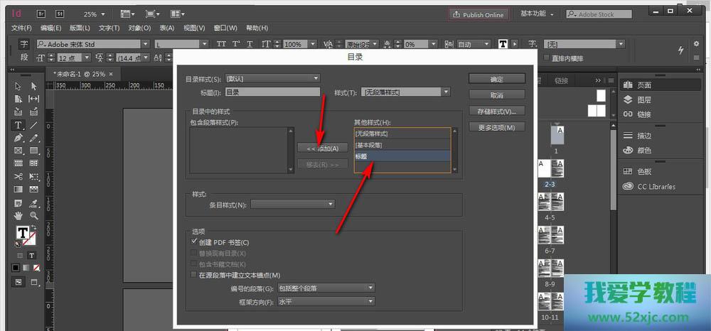 5、版面—目次。正在弹出的对话框中点击题目和目次后点击<<增添。如图