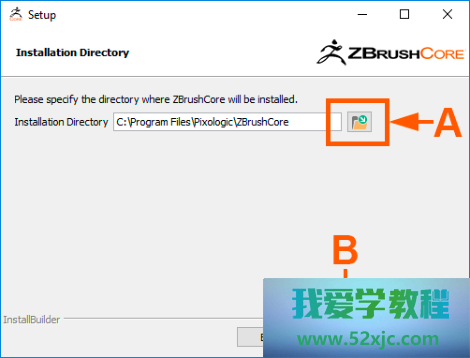 装配标准指定将要装配ZBrushCore的默认途途。正在Windows中,ZBrushCore将装配正在C:\Program Files\Pixologic的文献夹。正在Mac OS X中,它将被装配到利用标准。假若您满足该默认名望,只需单击“装配”按钮(B)。