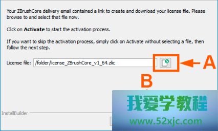 点击浏览文献图标(A)并采取您的许可证文献(将具有.zlic扩展名)。一朝拣选后,单击“激活”按钮(B)来启动激活流程。