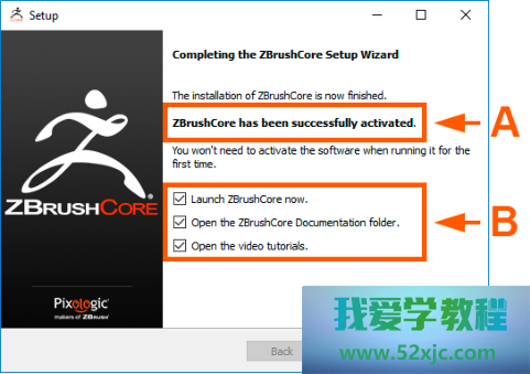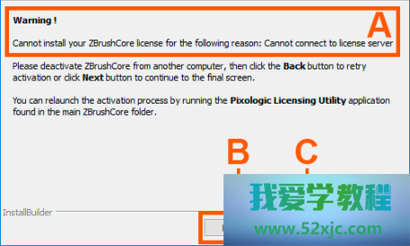 单击“重试”按钮(B)以返回到前一页,并再次采取许可证文献或单击“跳过激活”按钮,(C) 以便正在稍后阶段举办激活。假若您跳过激活次序,正在初次运转ZBrushCore时将央求您举办激活。正在这种情形下,您将需求遵从以下“从ZBrushCore激活”章节的证据。