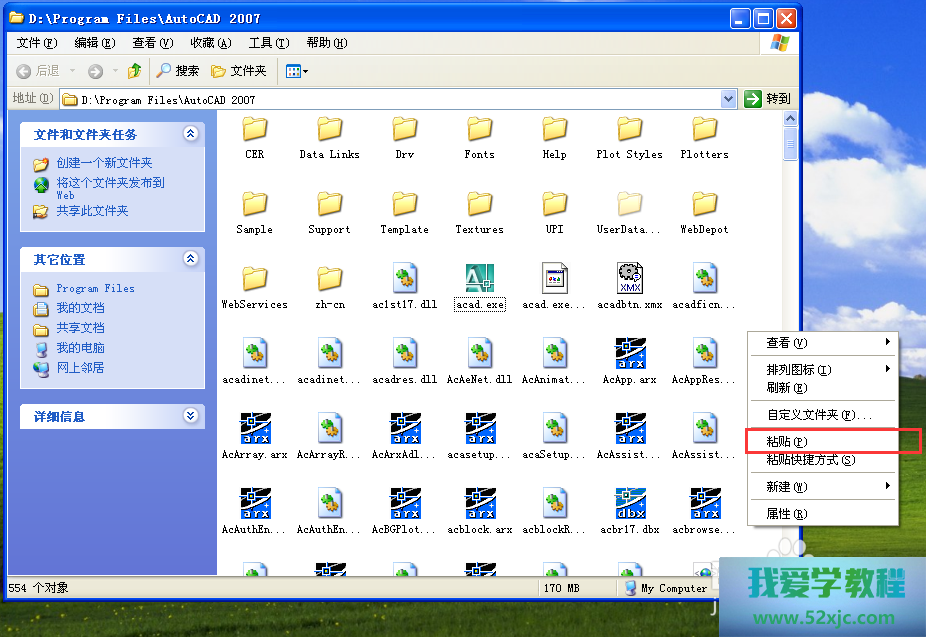 然后右击桌面的CAD图标,假若你是WIN7体例,就抉择翻开文献地方,我的是XP体例,以是抉择属性,然后查找对象,之后会翻开一个文献夹,然后再空缺的地方右击粘贴,用刚刚的问价更换掉从来的文献就可能了,操作完后封闭文献夹,CAD就可能寻常利用了。