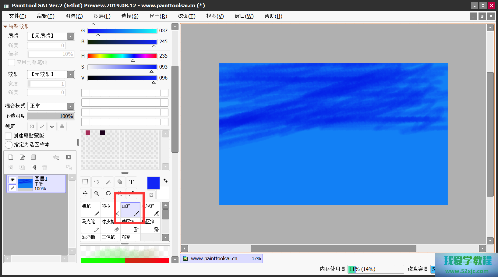 方法二:正在画布当中绘制一个长条!最先,咱们需求挑选一个前景象,日常绘制星空的话,咱们挑选“浅蓝色”。并挑选“油漆桶”将整体画布涂上颜色,如下图所示。