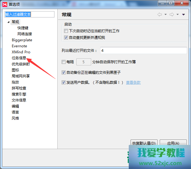进入到了首选项的界面中,正在列外中找到为劳动讯息的选项。