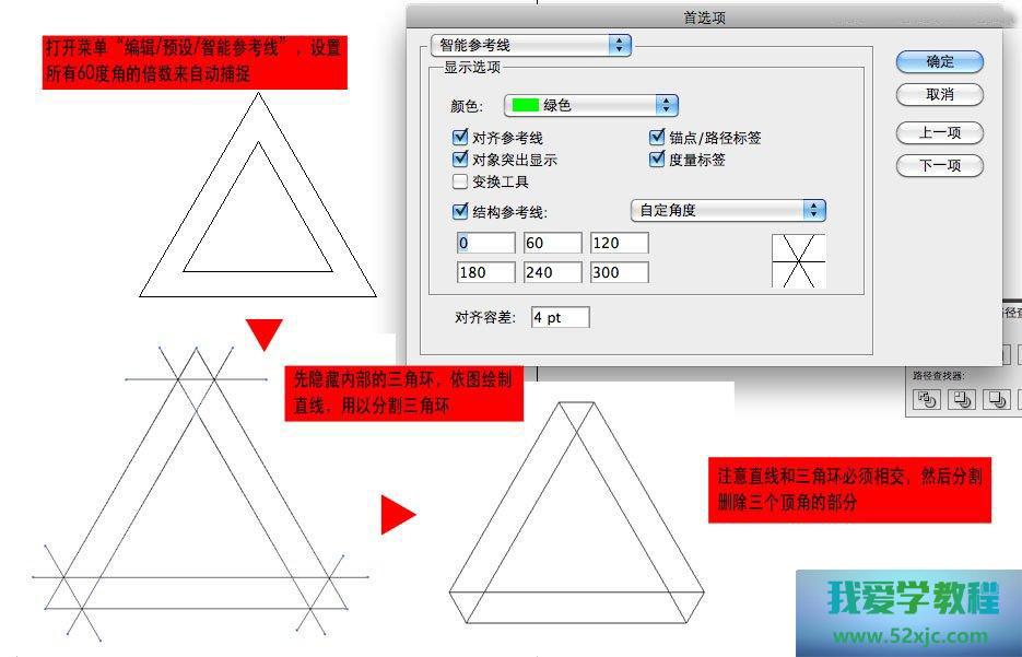 4.掀开菜单的编辑/预设/智能参考线,成立总共60度角的倍数来自愿搜捕。先埋没内部的三角环,依图绘制直线,用以支解三角环。留意直线和三角环必需结交,然后支解删除三个顶角的片面。