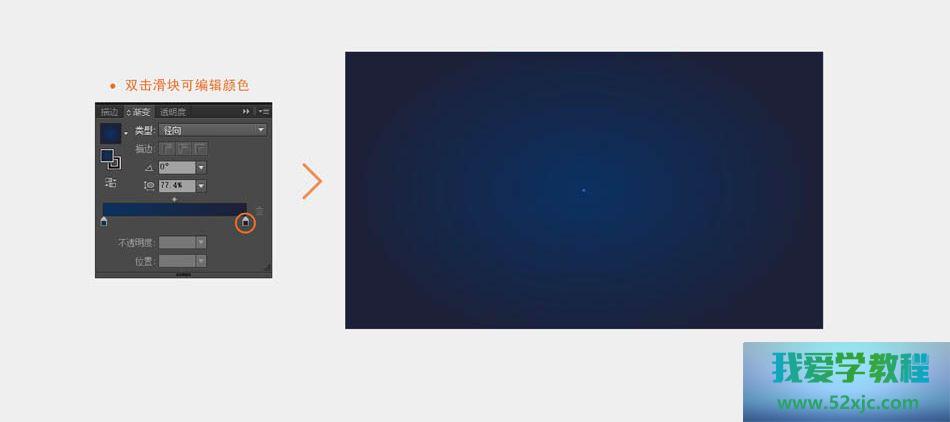 2.用渐变用具给矩形填色渐变,描边:无,类型:径向。
