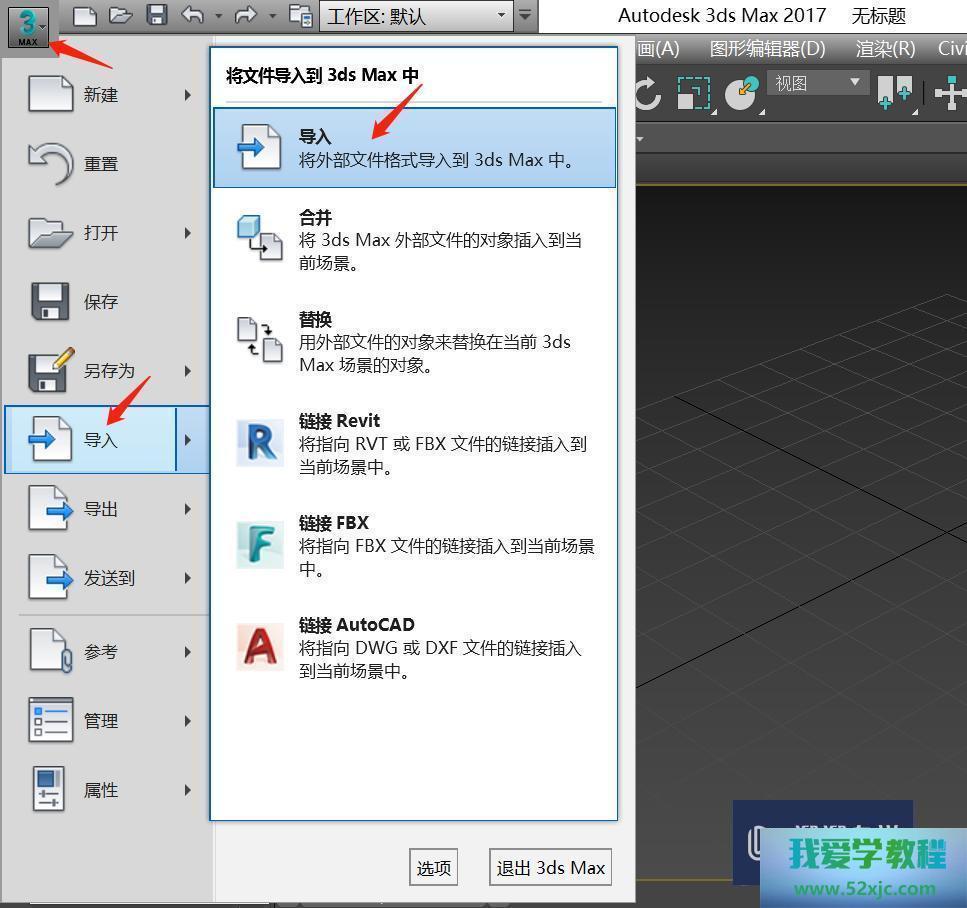 第4步翻开3ds Max 2017,点击左上角图标,选拔导入