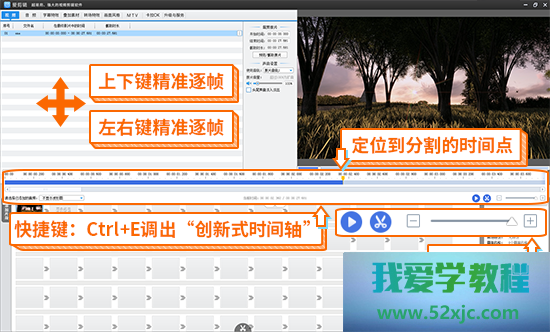 鼠标点击右侧视频预览区下偏向下隆起的箭头,调出“改进式韶华轴”(赶紧键:Ctrl+E),放大韶华轴,鼠标定位到决裂的韶华点,点击界面上的“铰剪手”图标(赶紧键:Ctrl+Q),即可一键决裂视频。