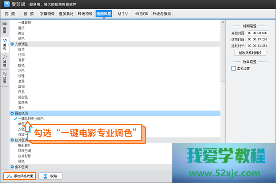 正在“画面作风”-“美化”面板下可能遵照视频状况调动视频色调。如:勾选“一键影戏专业调色”等。