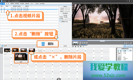 将视频决裂成若干段后,点击视频缩略图右上角的“×”,即可删除不须要的片断。