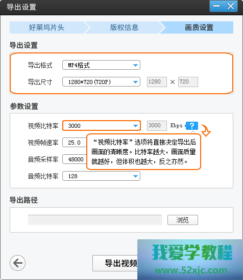 点击界面右下角的“导出视频”,正在“画质筑设”处选取导出视频的样子和诀别率,并窜改“视频比特率”巨细。