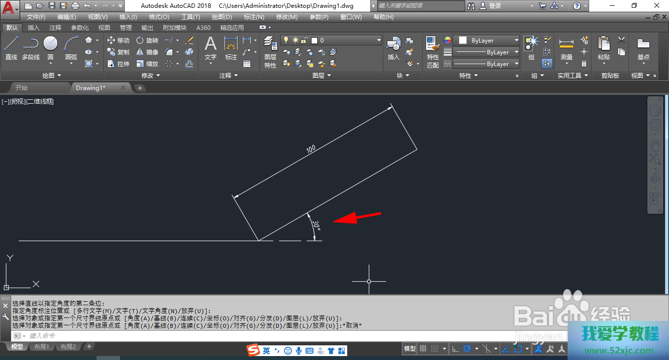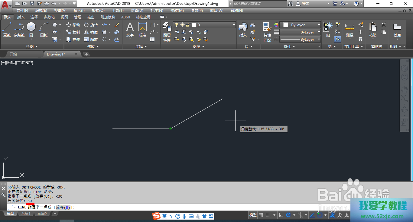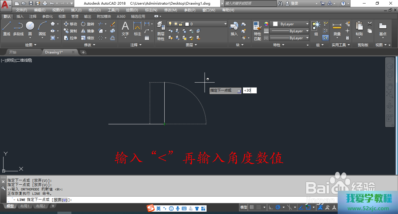 要绘制倾斜角度的直线且已知角度,号令栏没有角度号令提示,此时可输入“<”加角度数值式样输入。譬喻要画正30°的斜线,就输入“<30”