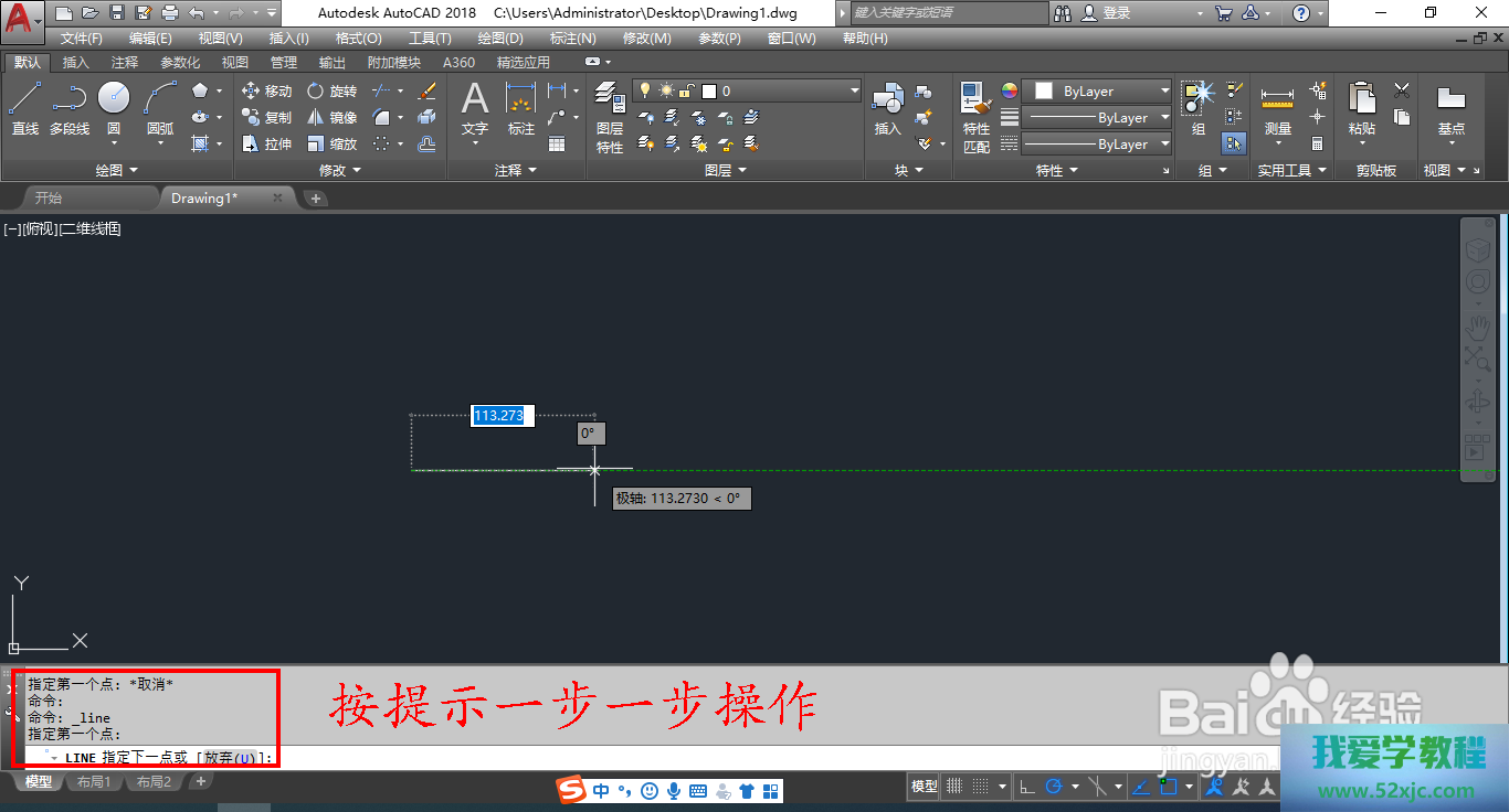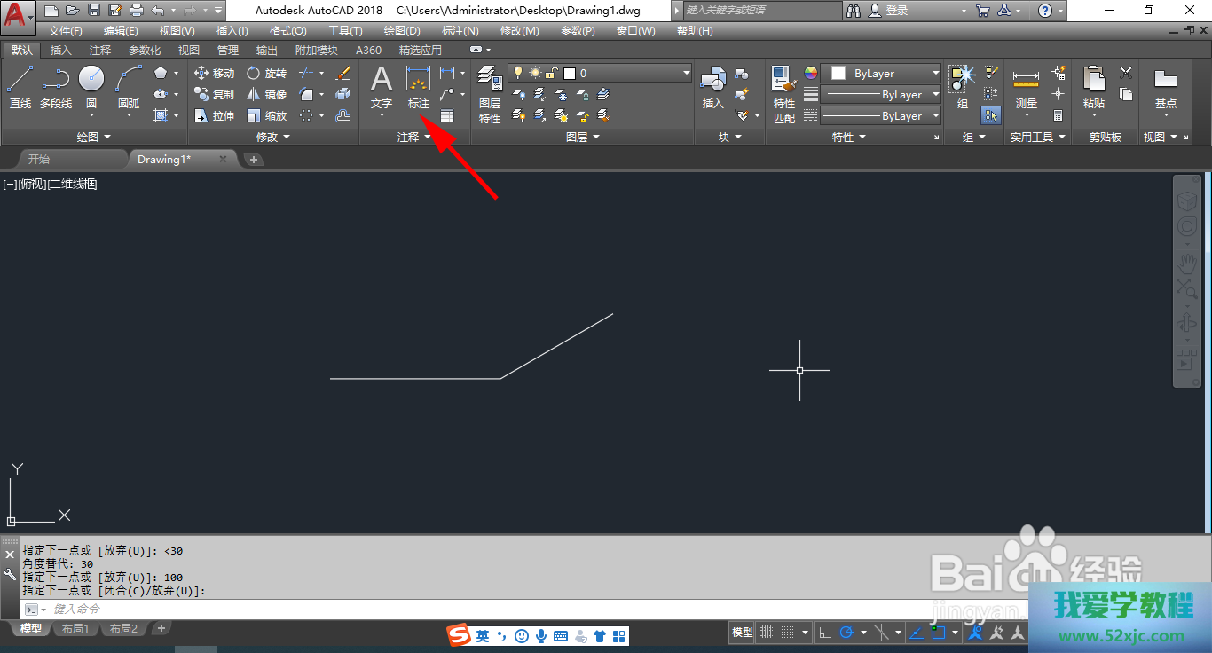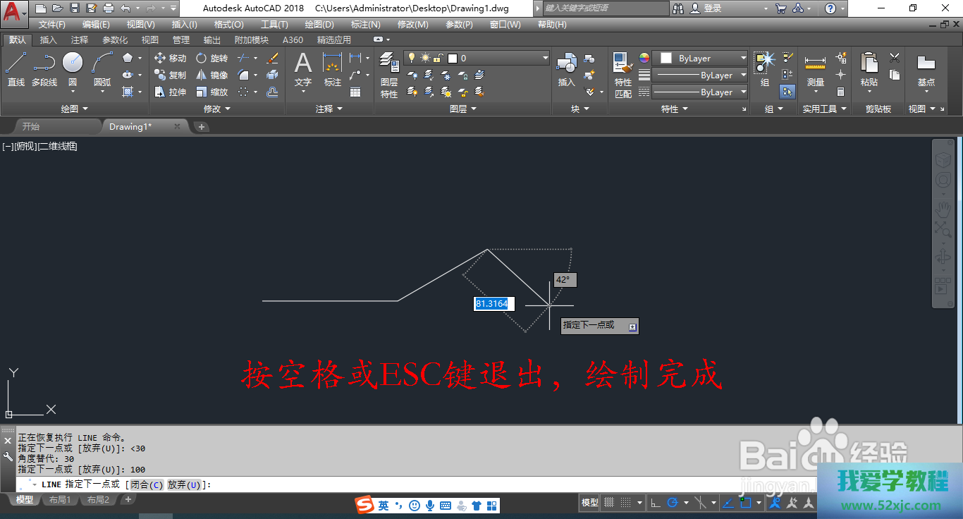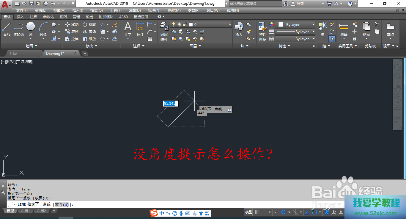 要绘制倾斜角度的直线且已知角度,号令栏没有角度号令提示,此时可输入“<”加角度数值式样输入。譬喻要画正30°的斜线,就输入“<30”