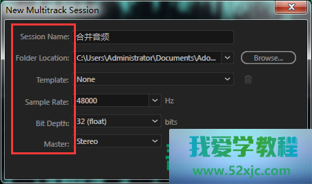 正在New MultitrackSession(新修众轨道音频)对话框可能创立文献名称、存放位子、模板等音讯,点击OK按钮,已毕创修;