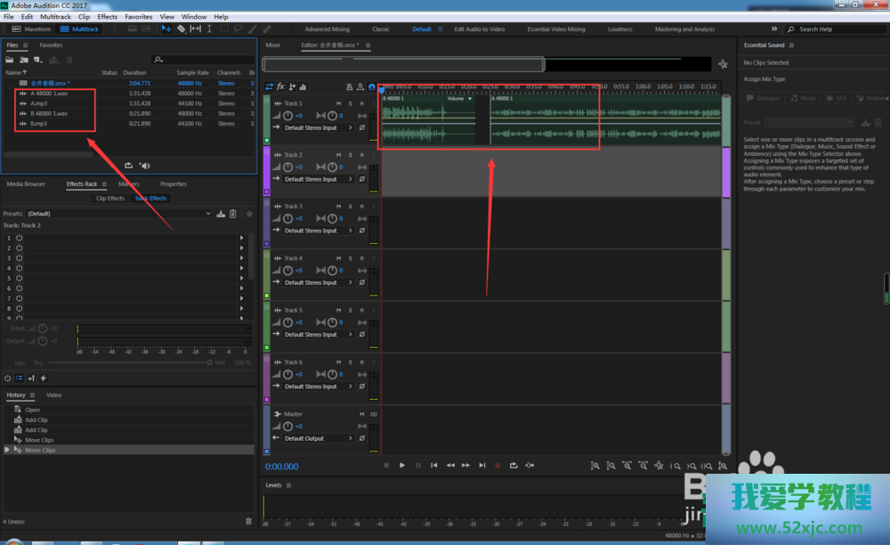 正在文献窗口将两个文献服从本人的须要,分挨次拖到右边的轨道里,导入的文献时MP3花式的,体系会自愿转换一个.WAV文献出来,这个无须忧愁;