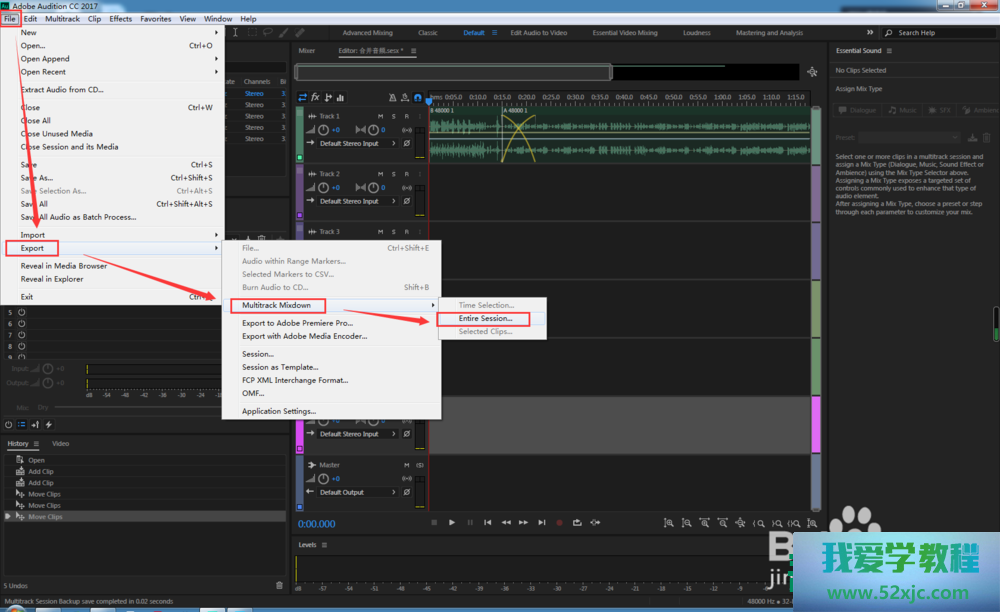 导出一经团结好的音频文献,点击文献(File)菜单→导出(Export)→众音轨混杂(Multitrack Mixdown)→通盘对话(EntireSession);