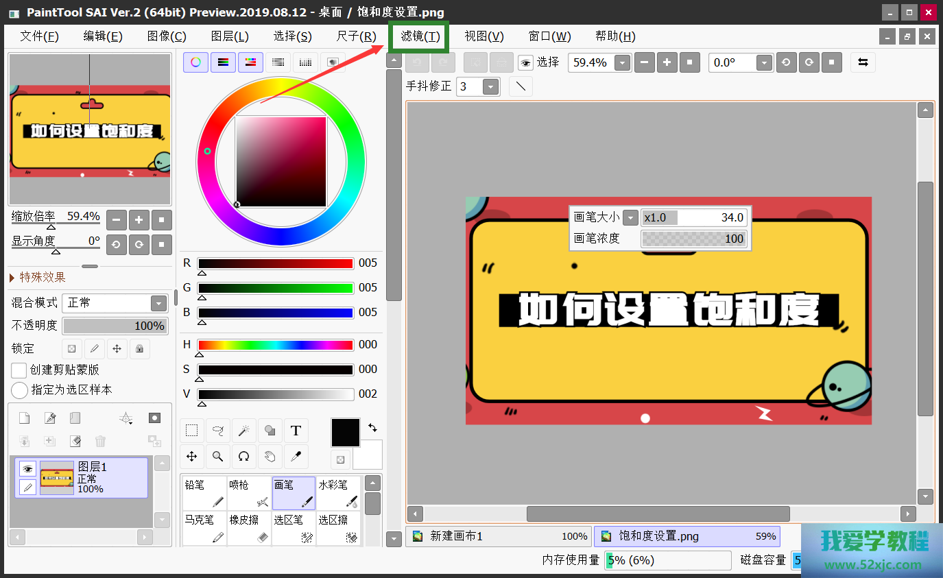 步调二:点击SAI软件菜单栏上面的“滤镜”菜单按钮(留心:以下操作务必是导入过了图像才华平常显示);