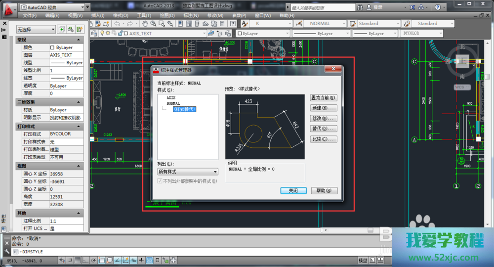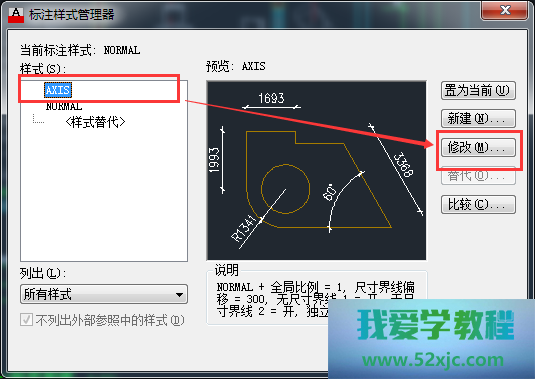 正在弹出标注样式约束器中找到方才的AXIS样式。选拔AXIS样式,点击“改正”,