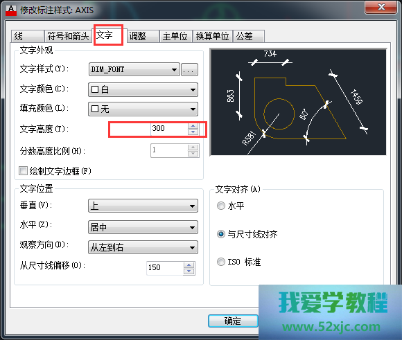 正在此咱们可能改正标注的闭系参数。但我就只以改正字体的字号巨细。点击“文字”可能看到文字的高度为300,就改正它就行了。默认1:1的打印是2.5的字号高度。这里图纸是1:50。因此最低改成2.5*50打印才看得大白。