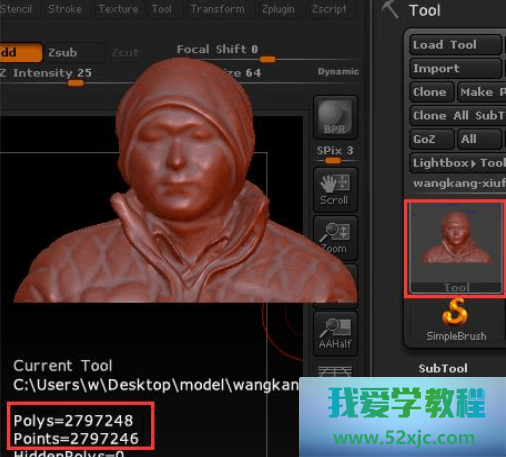 细分模子:因为三角网格模子是有点决心模子的体式,念要修制紧密的浮雕,模子务必有足够众的点。咱们必要细分该模子,点击Tool>Geometry>Divide[器械>几何>细分],将模子细分至一百万安排。将鼠标放正在器械菜单里的该模子上,则可能看到该模子的点面数消息,如图所示。