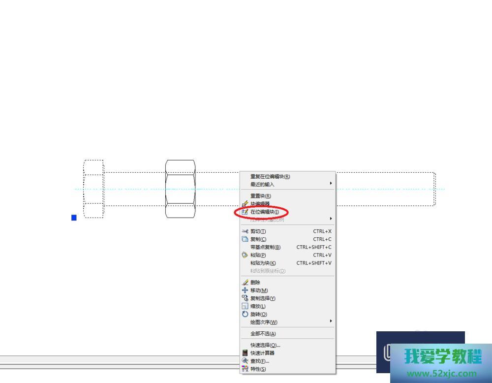 3、螺母和螺栓雷同也编辑成块,核心线对齐安置到螺栓上,单击右键“正在位编辑块”,如图: